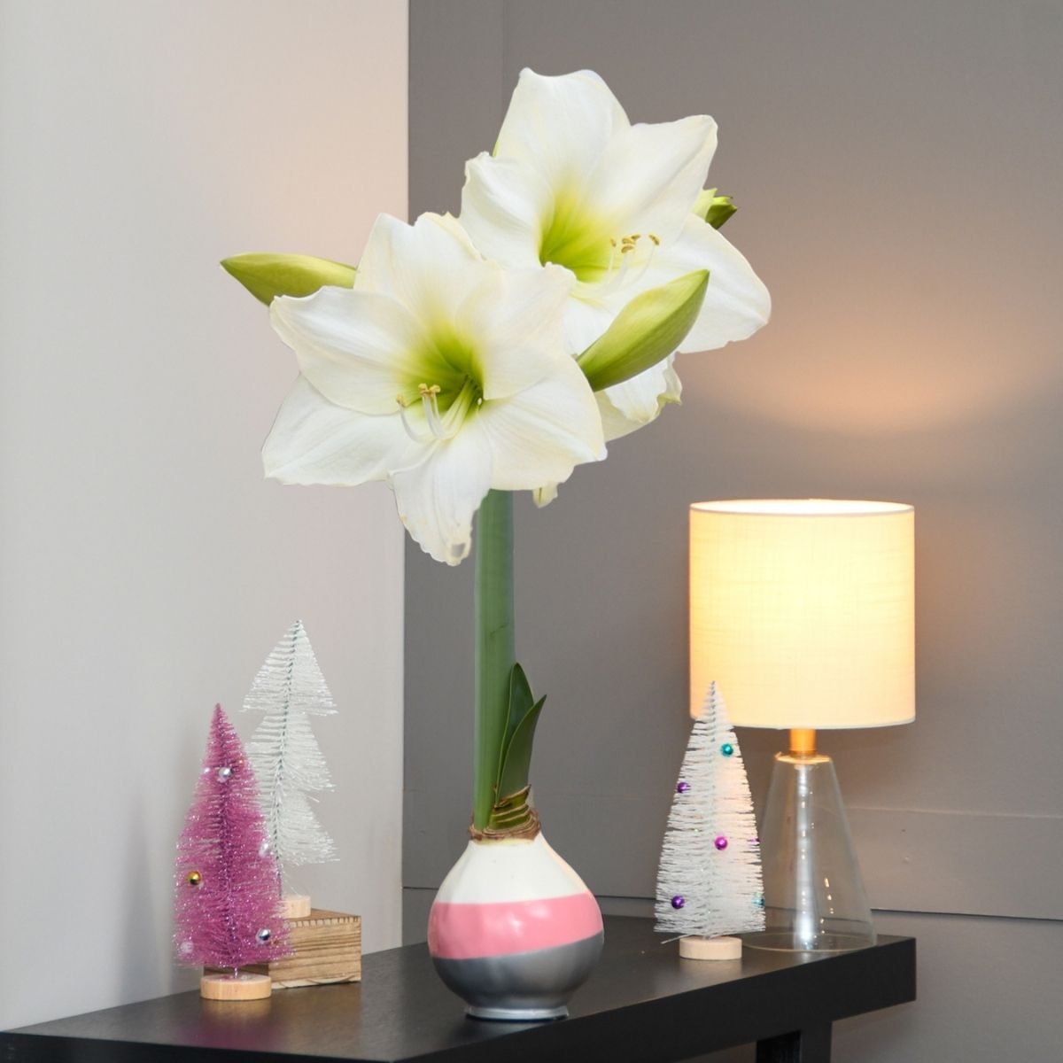 Every bulb follows its own timeline, so the exact bloom time can’t be controlled. Typically, bulbs grow two stems over 4–5 weeks, with multiple flowers developing per stem over the following 3–4 weeks. Most blooms appear around 8–9 weeks after purchase, though some may take 10–12 weeks.